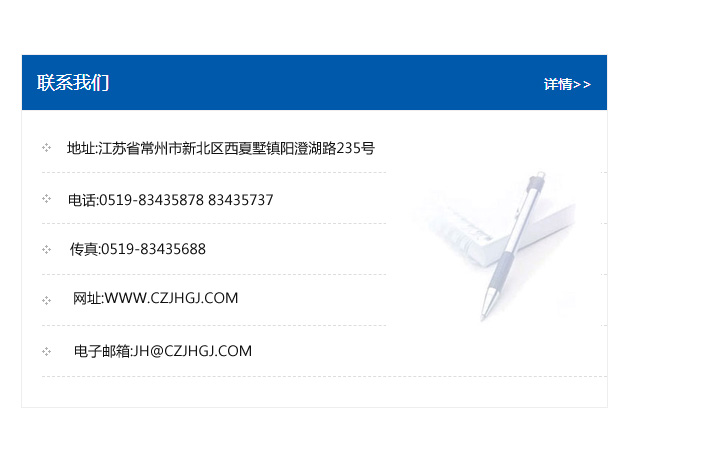 地址:常州市新北區友邦商務大廈1幢16、17層  電話:0519-85101652  傳真:0519-85112595  郵編:213022  網址:www.cz-jiayue_cn.dzxdzx69.com  郵箱:xiajifengaa@163.com